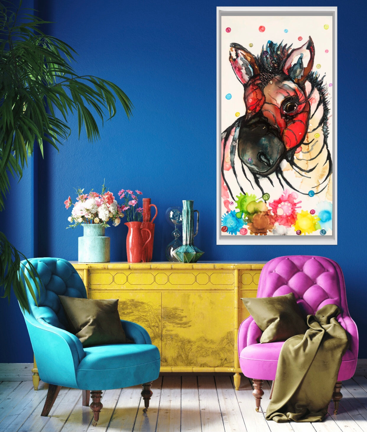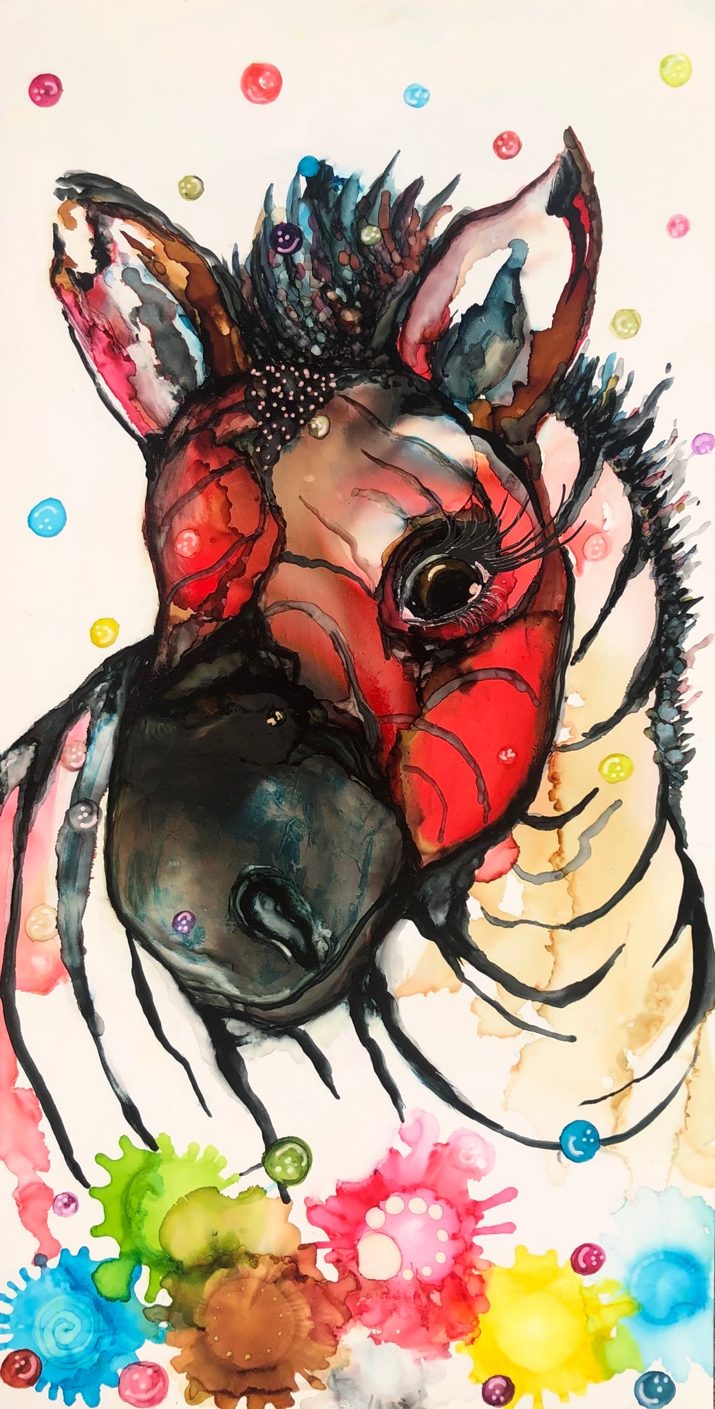 This whimsical happy zebra is painted with alcohol inks on canvas.